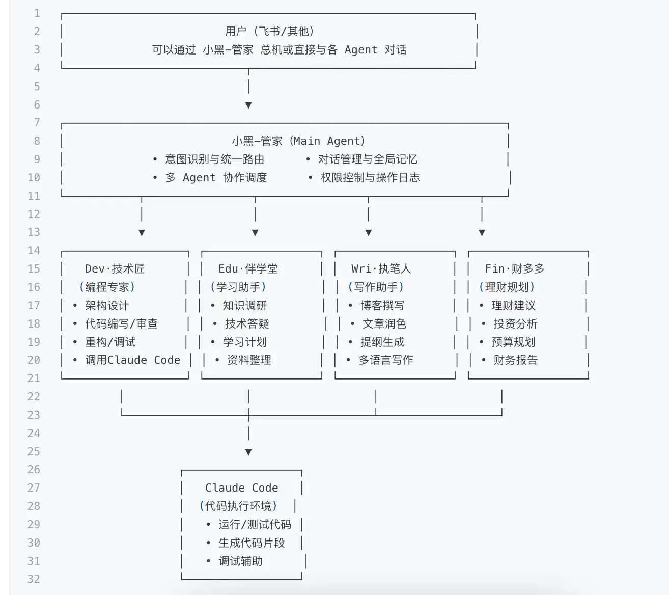 图 2:一人团队 Multi-Agent 系统架构 - 用户通过小黑 - 管家与 4 个专业 Agent 交互