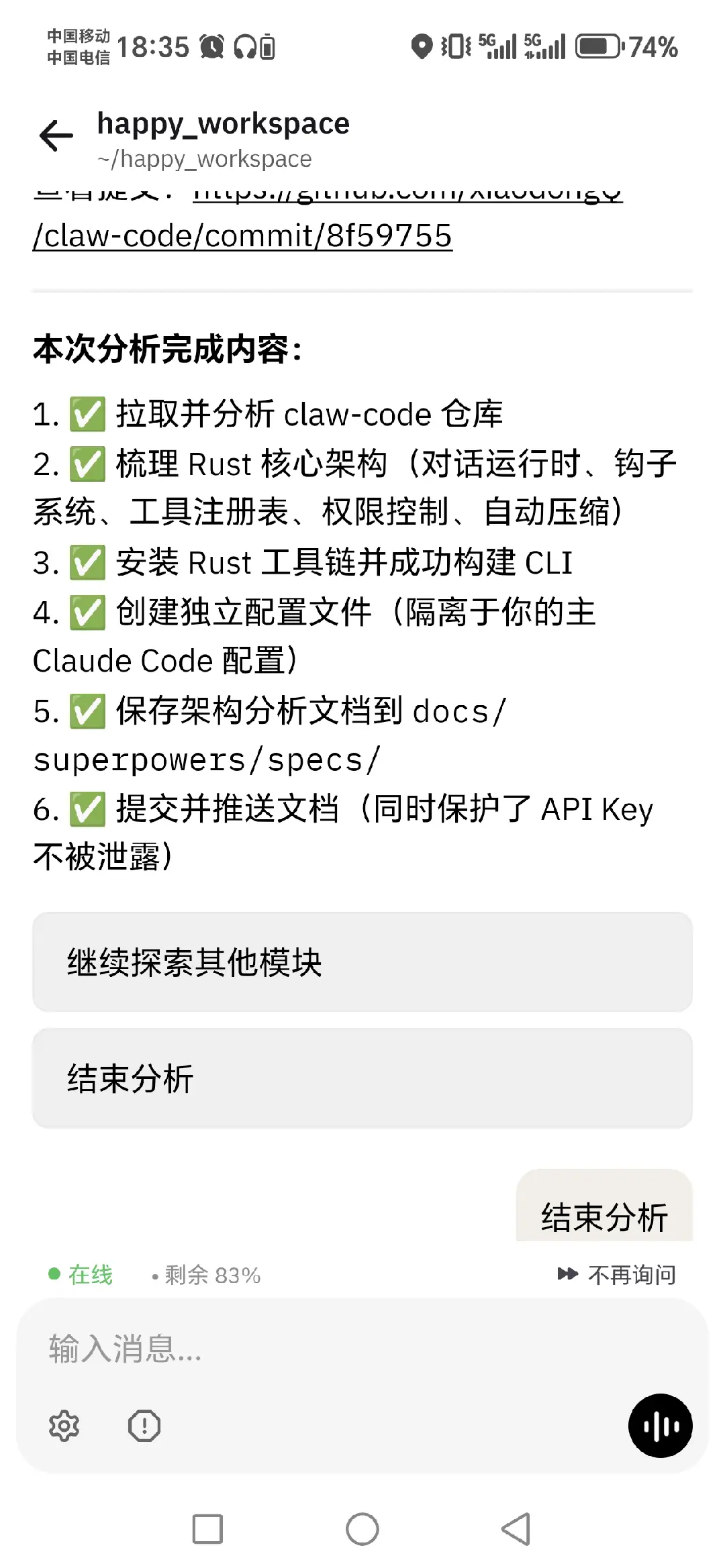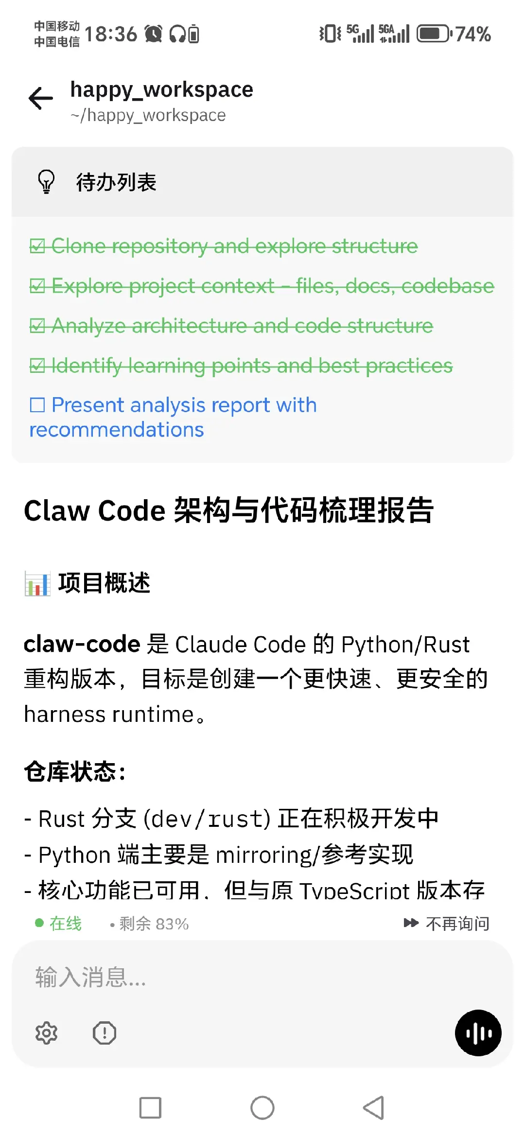 有了happy-coder,可以在手机上随时随地让 Claude Code 处理复杂任务。比如最近 Claude Code 源码泄露事件,我用手机让 Claude Code 分析了别人用 Rust 重写的版本:claw-code。